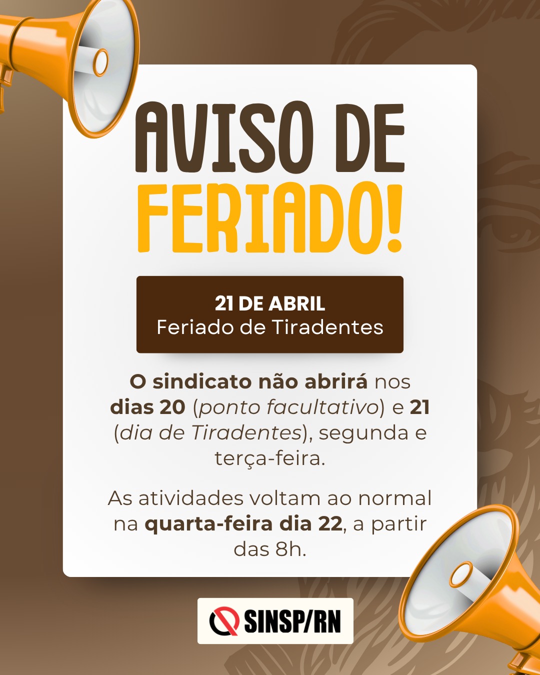 O governo do RN decretou ponto facultativo na próxima segunda-feira (20), véspera ao feriado de tiradentes, comemorado em todo o Brasil. Por esse motivo, as repartições da Administração Pública Direta e autarquias estaduais em todo o Rio Grande do Norte estarão fechados.