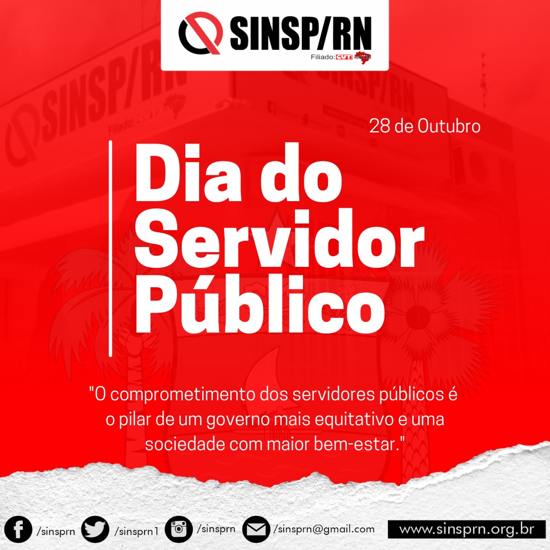 O Sindicato dos Trabalhadores do Serviço Público da Administração Direta do Estado do Rio Grande do Norte parabeniza, neste dia 28 de outubro, cada um dos mais de 100 mil servidores e servidoras públicas do Estado do Rio Grande do Norte, que se dedicam nos seus locais de trabalho e exercem suas funções com excelência para toda a sociedade.