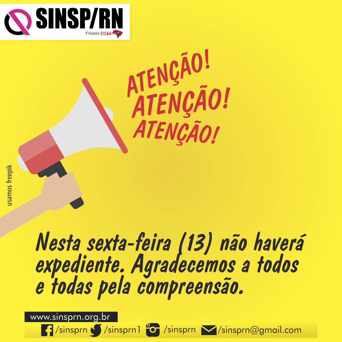 Nesta sexta feira (13) não haverá expediente na sede do SinspRN. As atividades voltarão normalmente a partir da segunda-feira(16) da próxima semana. O sinsp agradece a compreensão de todos e todas que fazem parte do sindicato e buscam o atendimento diário para tirarem dúvidas, encaminharem documentos ou realizarem outros serviços.