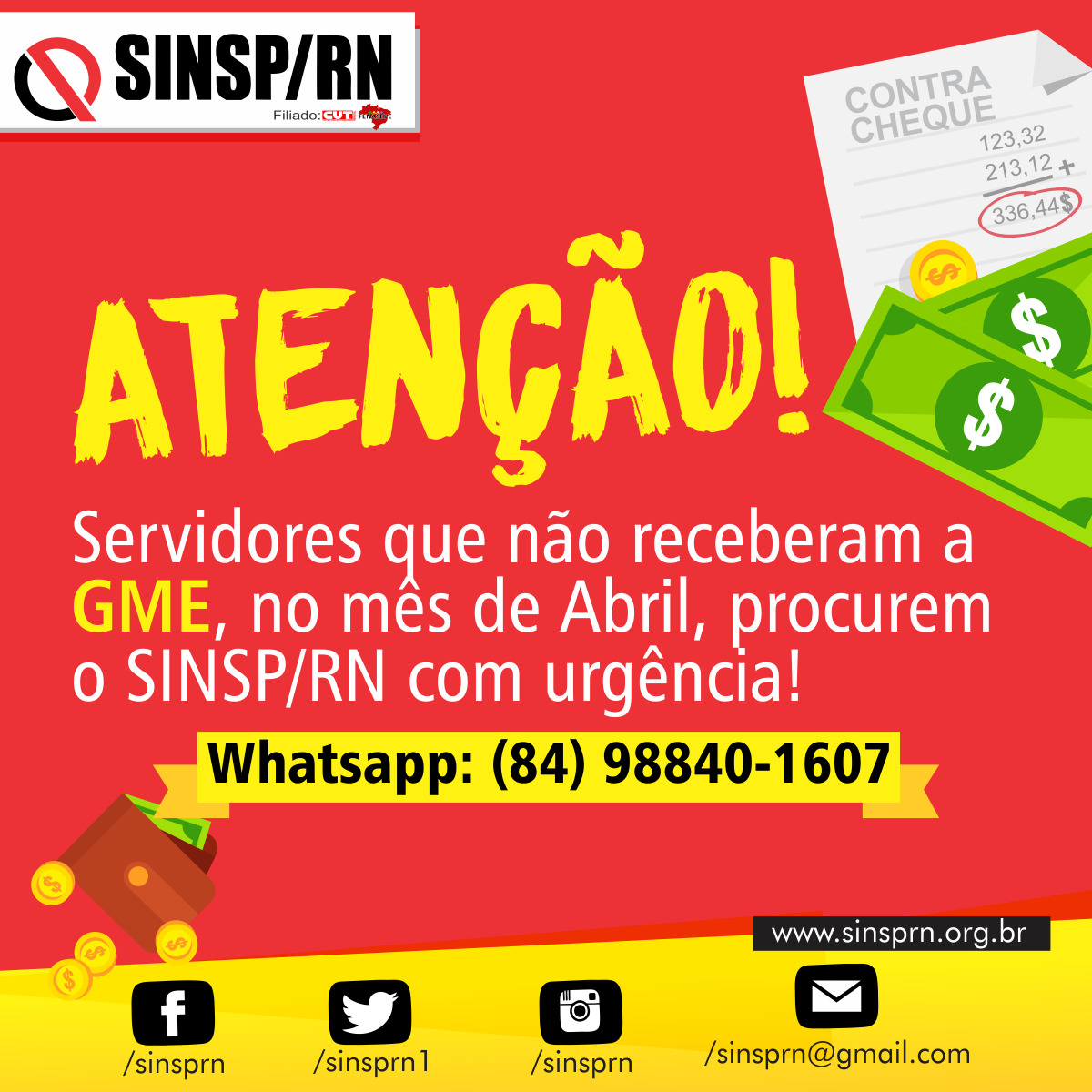 A diretoria do Sinsp/RN pede a todos os servidores que não receberam a GME no mês de abril ou identificaram alguma alteração no seu contracheque, enviem para o SINSP/RN uma cópia do seu contracheque de abril, para o nosso email: sinsprn@sinsprn.org.br, ou ainda em nossa sede que está localizada na esquina da Rua podi com a Princesa Isabel, no centro da cidade. O Sinsp/RN seguirá com todas as providências necessárias para regularizar o pagamento da GME e quaisquer outras irregularidades que possam ser encontradas.