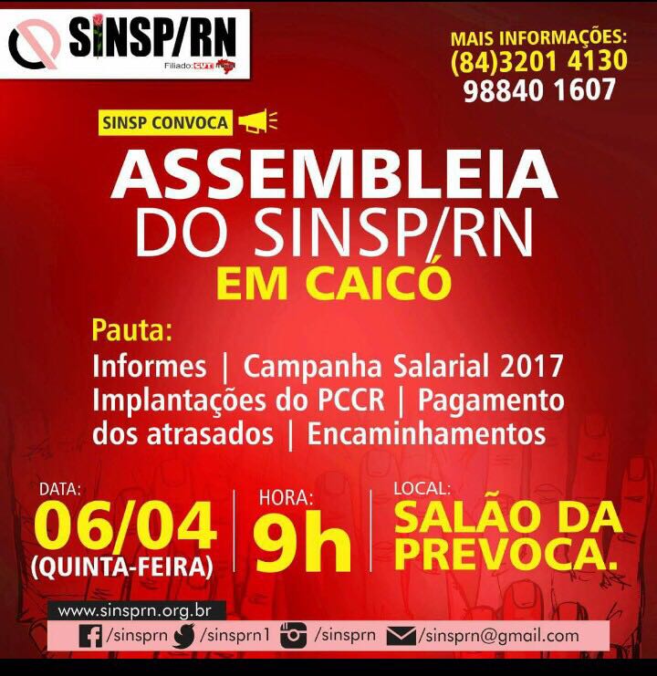 Desde já, a direção do SINSP RN conta com a presença de todos os servidores da cidade de Caicó e região. Vamos à luta!