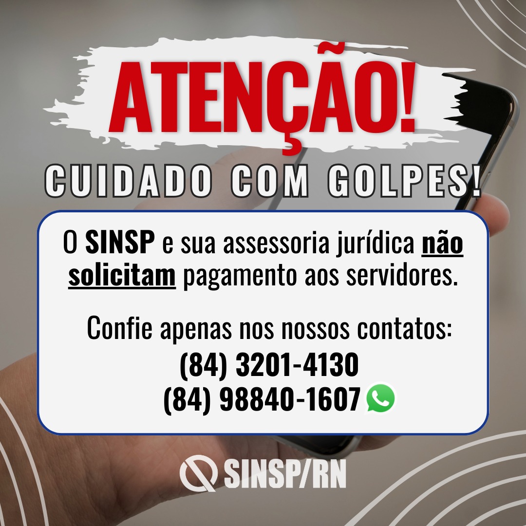 – Caso alguém se passe por diretor, advogado ou funcionário do SINSP e entre em contato com você, confie exclusivamente nos nossos contatos oficiais: 84 3201-4130 / 84 98840-1607 (Whatsapp);