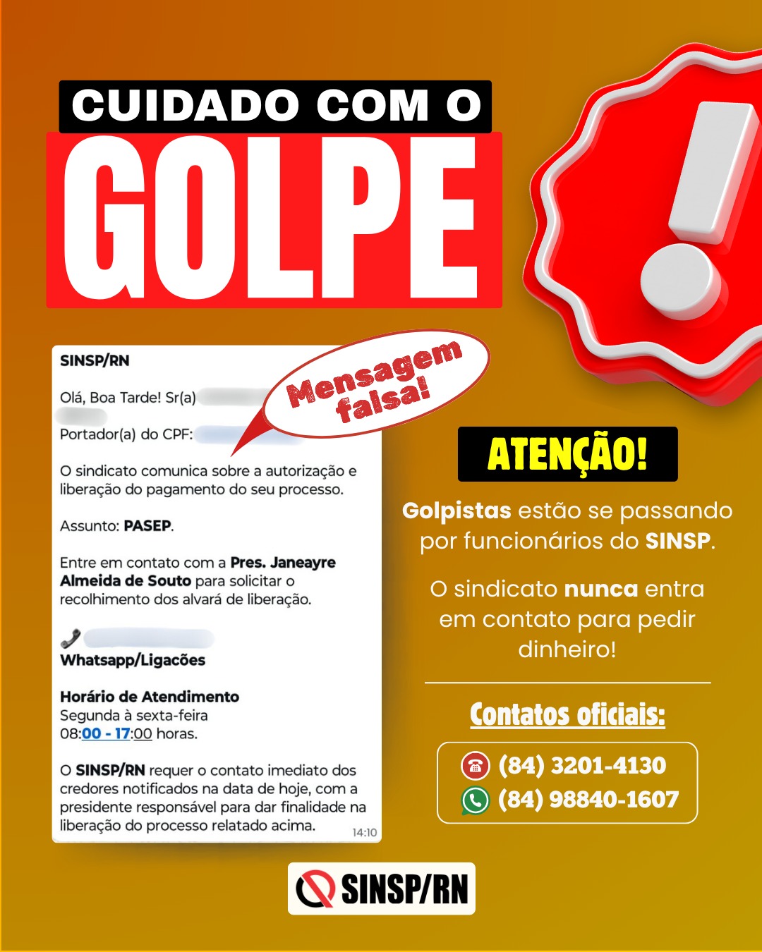 – Caso alguém se passe por diretor, advogado ou funcionário do SINSP e entre em contato com você, confie exclusivamente nos nossos contatos oficiais: 84 3201-4130 / 84 98840-1607 (Whatsapp);