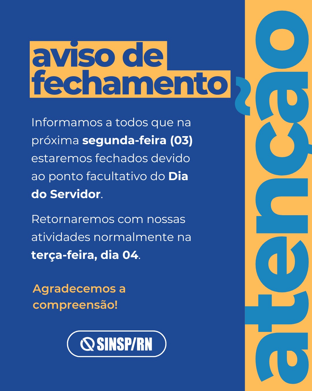 Servidora e servidor, aproveite o descanso e caso necessite de atendimento, procure o SINSP até esta sexta (31).