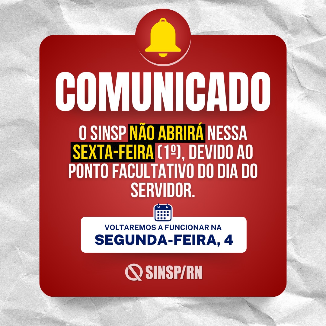 Compartilhe Telegram WhatsApp Facebook Twitter Email Copy Link Atenção, servidor! O ponto facultativo do Dia do Servidor Público foi transferido para esta sexta-feira (1º). Com isso, o SINSP estará fechado! Reabriremos na próxima segunda-feira (04). Veja mais informações: Dia do servidor público! Feliz 28 de outubro!
