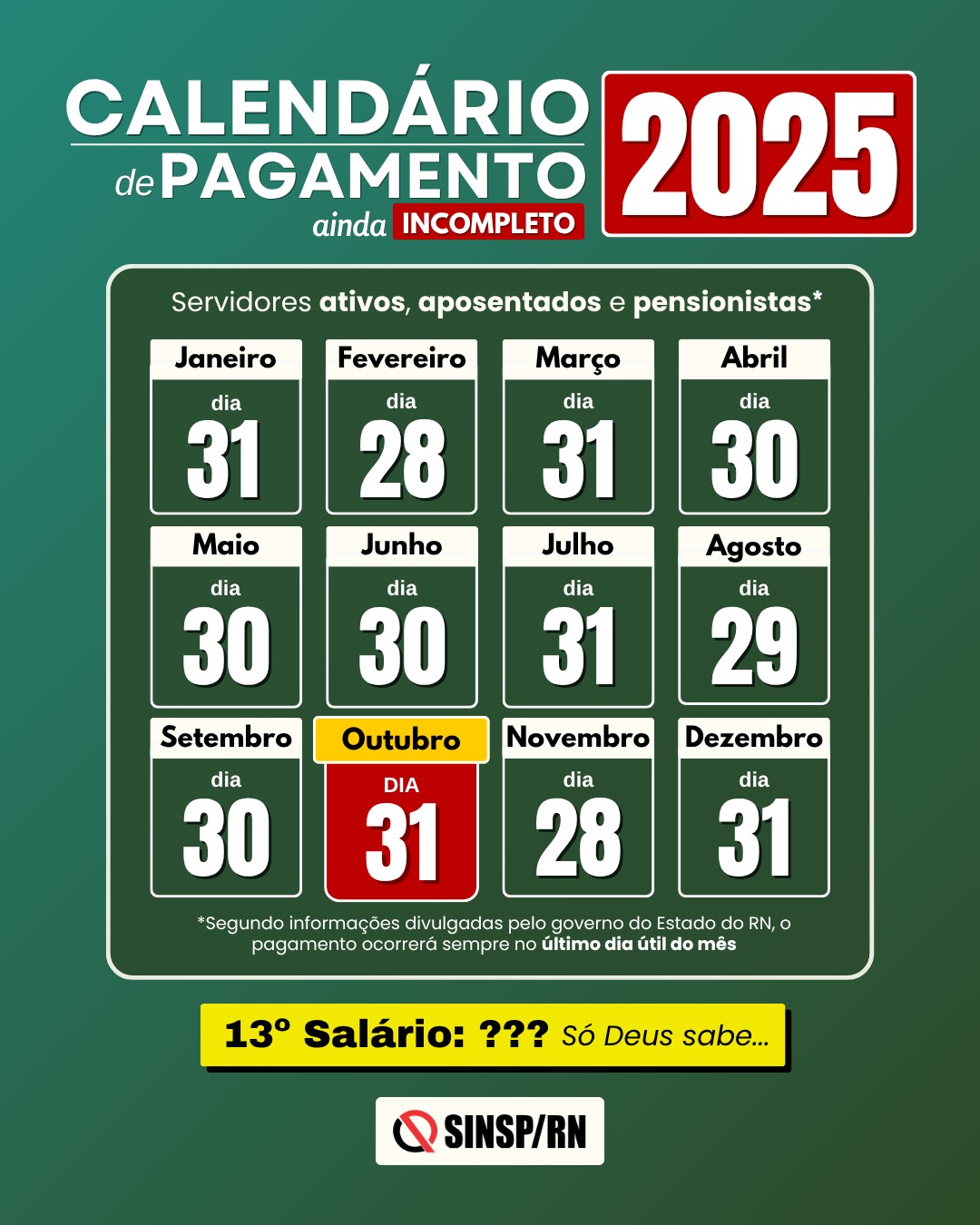 Infelizmente o calendário de pagamento ainda se mostra incompleto, pois os servidores não sabem quando vão receber seu 13º salário.