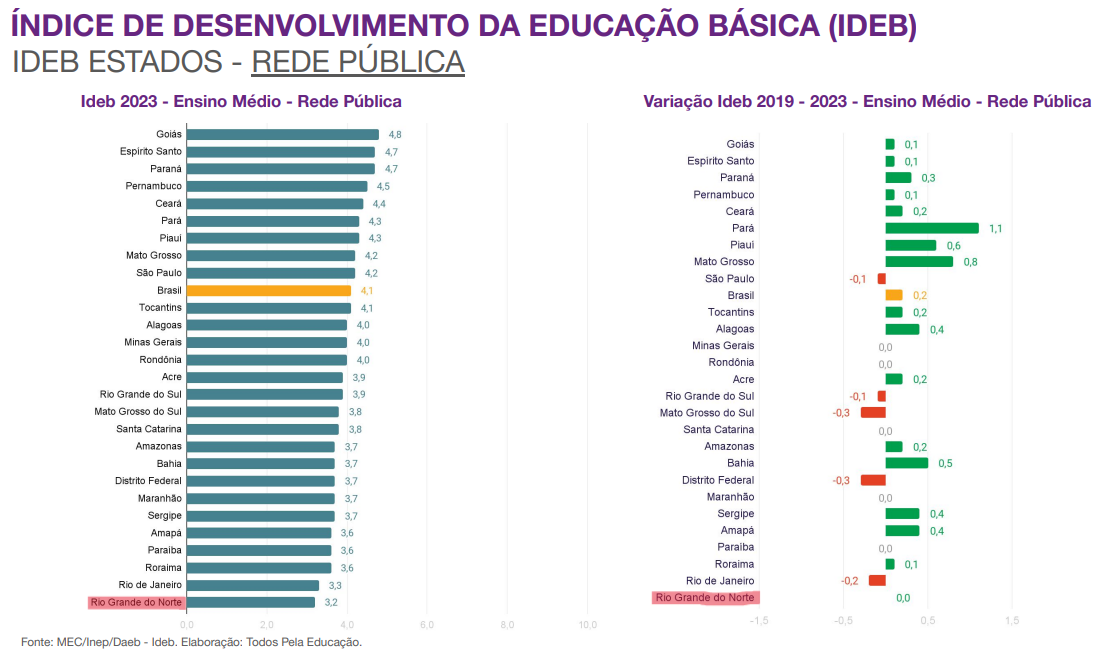 Pela segunda vez consecutiva a rede estadual de ensino teve o pior ensino médio de todo o Brasil. O RN já tinha tido o pior desempenho na última divulgação do Ideb, em 2021.