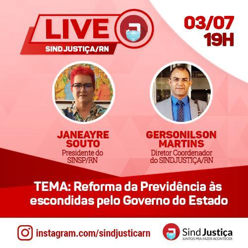 A presidenta do Sindicato dos Servidores Públicos da Administração Direta do Rio Grande do Norte vai participar de uma live no Instagram nesta sexta-feira, dia 03, sobre a reforma da Previdência estadual que tramita na Casa Legislativa. O debate on-line acontecerá às 19h, em conjunto ao diretor coordenador do Sindjustiça, Gersonilson Martins. O perfil na rede social dos dois sindicalistas é: @janeayrealmeida e @sindjusticarn .