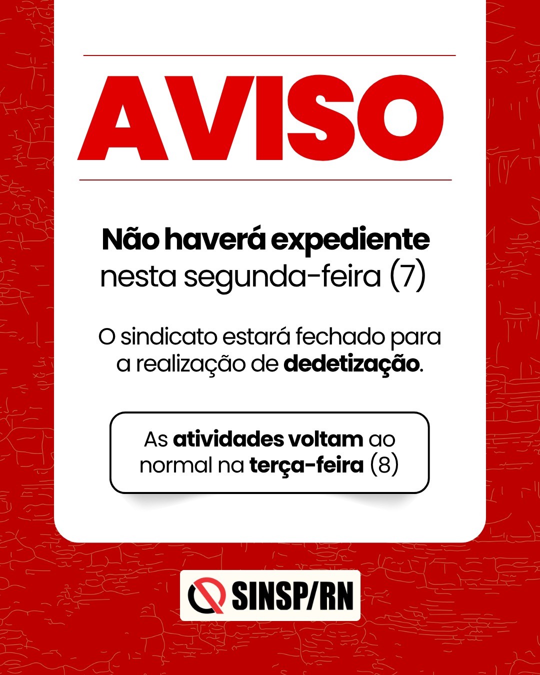 Na próxima segunda-feira (07), a sede do SINSP em Natal não vai ter atendimento ao público por conta da dedetizacão do ambiente. O atendimento normal ao público retorna na terça-feira (08), a partir das 8h.