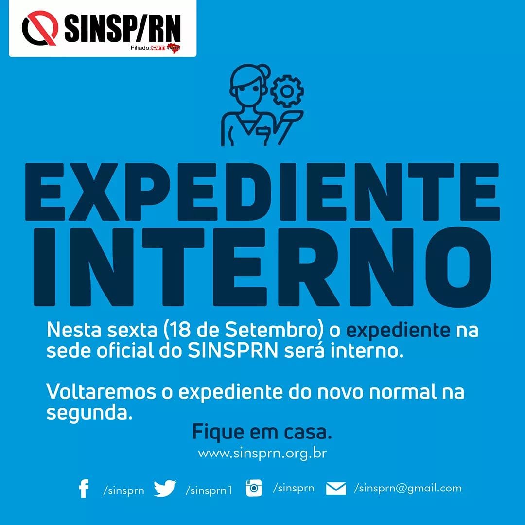 Nesta sexta (18), o SINSP vai ter expediente de trabalho interno, retornando o atendimento normal ao público na segunda-feira (21), a partir das 8h. O sindicato fica na Rua Princesa Isabel, 774 – Cidade Alta. O expediente vai até as 17h.