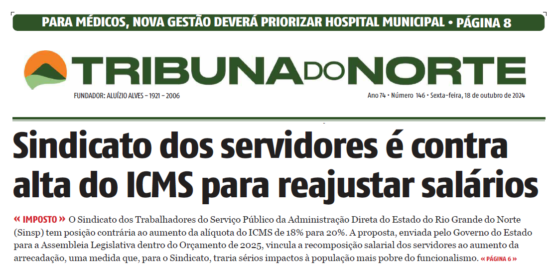 A edição desta sexta-feira (18) do jornal Tribuna do Norte trouxe em sua capa a defesa do SINSP para que o ICMS se mantenha em 18% no Rio Grande do Norte.