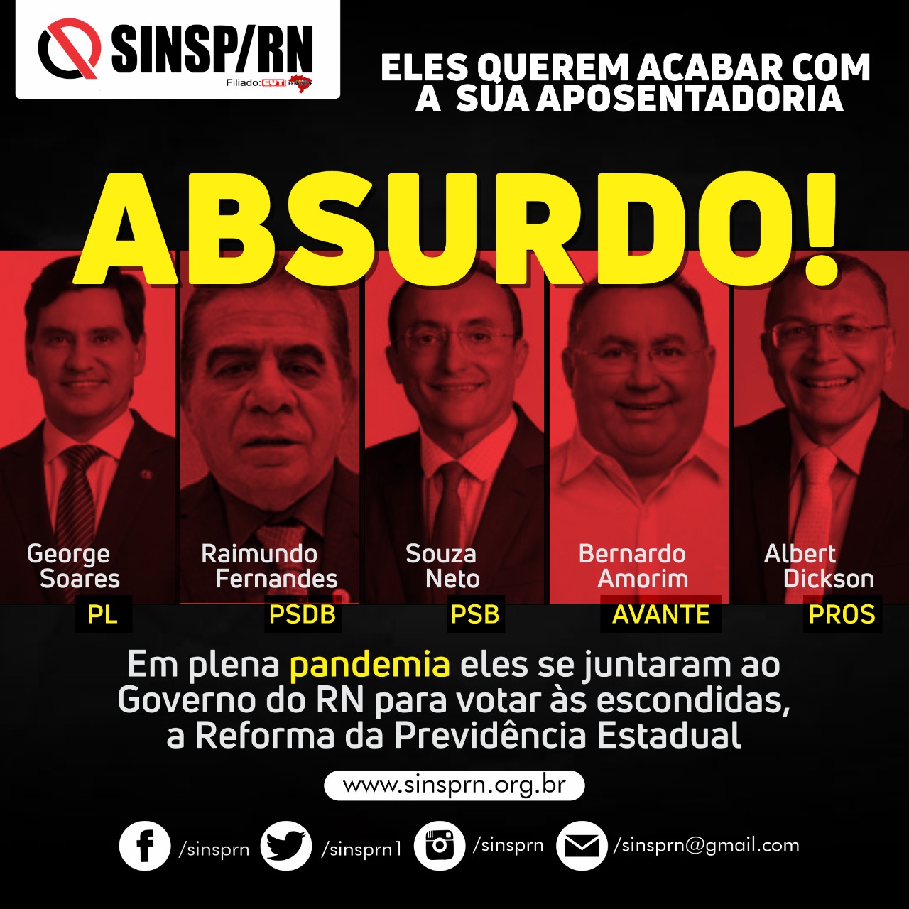 Além de George, parlamentares como Raimudo Fernandes (PSDB), Souza Neto (PSB), Bernardo Amorim (AVANTE) e Albert Dickson PROS), em plena pandemia, se juntaram ao Governo do RN para votar o projeto da Previdência às escondidas.