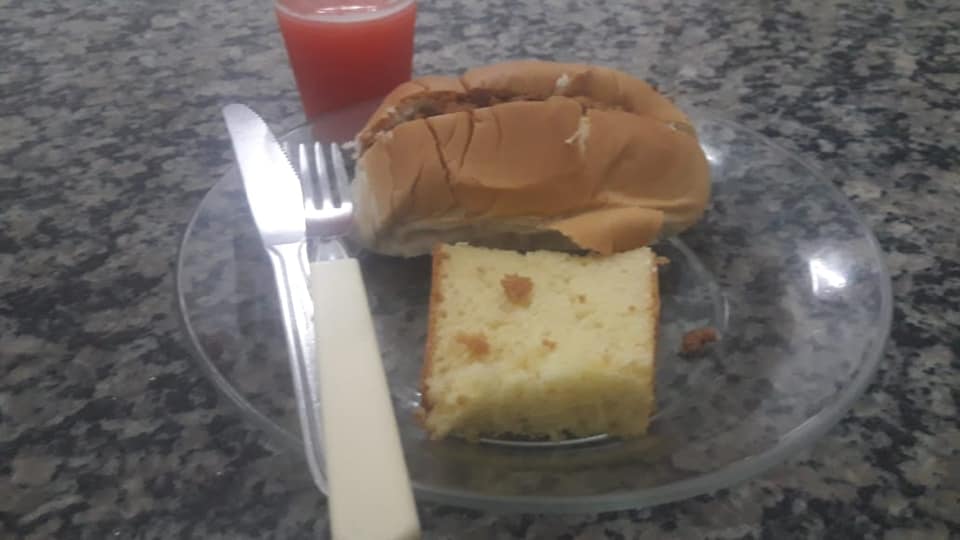 Em uma publicação feita por Sandro, ele mostra uma refeição dada a um dos profissionais no Hospital Regional Tarcísio Maia, em Mossoró/RN, que correspondem a um pequeno copo de suco, além de um pão e uma fina fatia de bolo.