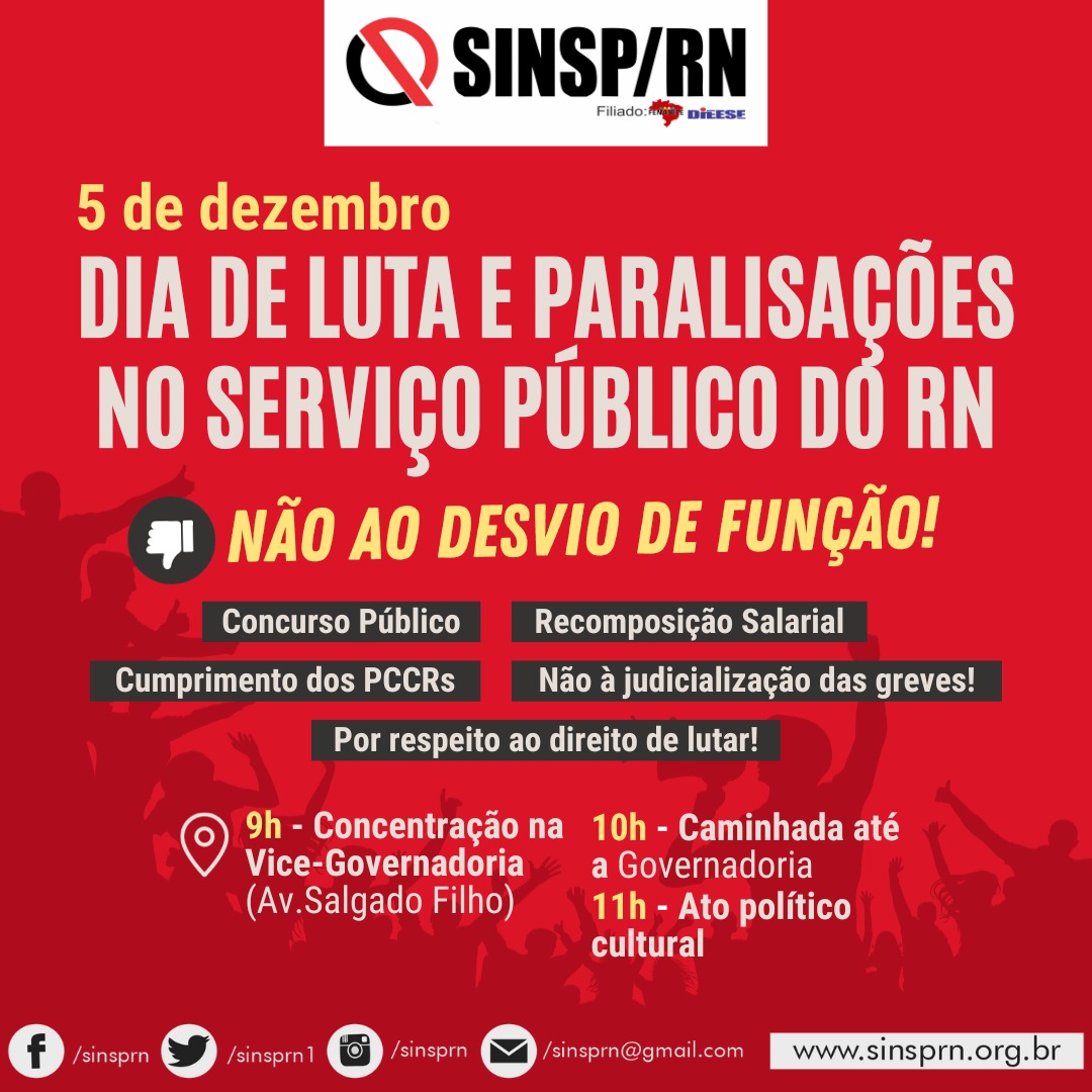 O SINSP participará do ato unificado do Fórum dos Servidores do Estado, marcado para próxima terça-feira (05), com concentração na vice-governadoria (avenida Salgado Filho), às 09h.