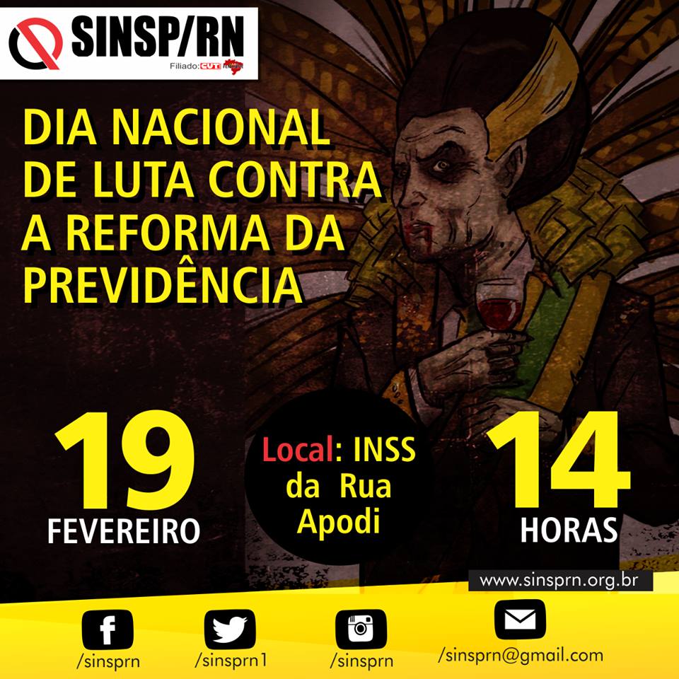 O Sinsp/RN conclama a todos os servidores públicos da administração direta do RN para participarem deste ato de defesa da Previdência Social. "Venha, chame seus amigos, colegas de trabalho, nesta segunda-feira (19) o seu local de trabalho e na rua Apodi, em frente ao prédio do INSS. Vamos barrar a Reforma da Previdência." Janeayre Souto, Presidenta do Sinsp/RN