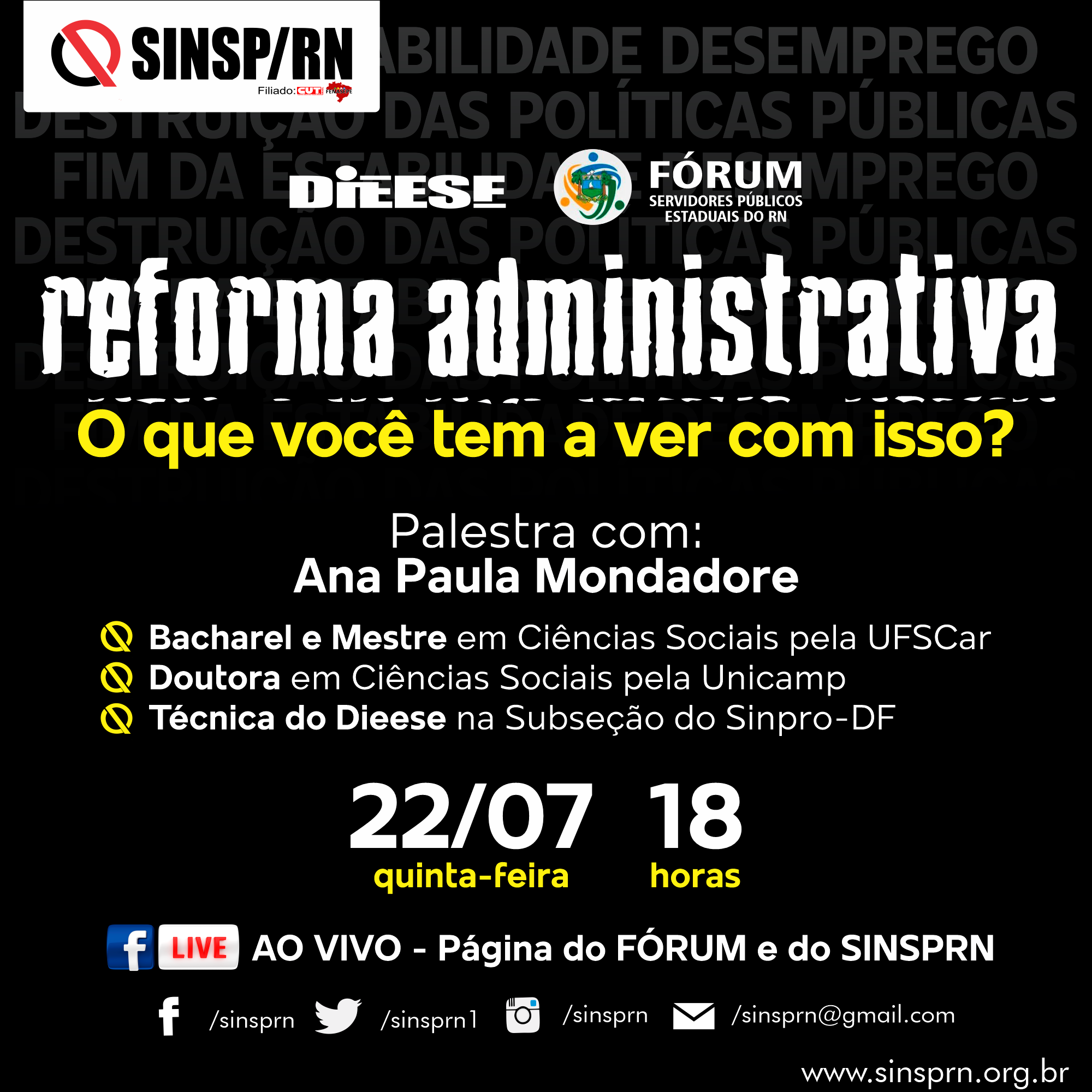 Nesta quinta-feira (22), às 18h, o Fórum Estadual dos Servidores convida todos os servidores a assistirem a live “Reforma administrativa: o que você tem a ver com isso?”, que contará com a palestra da técnica do DIEESSE/DF, Ana Paula Mondadore. A transmissão acontecerá na página do Facebook do Fórum e também na página do SINSP e terá uma hora de duração.