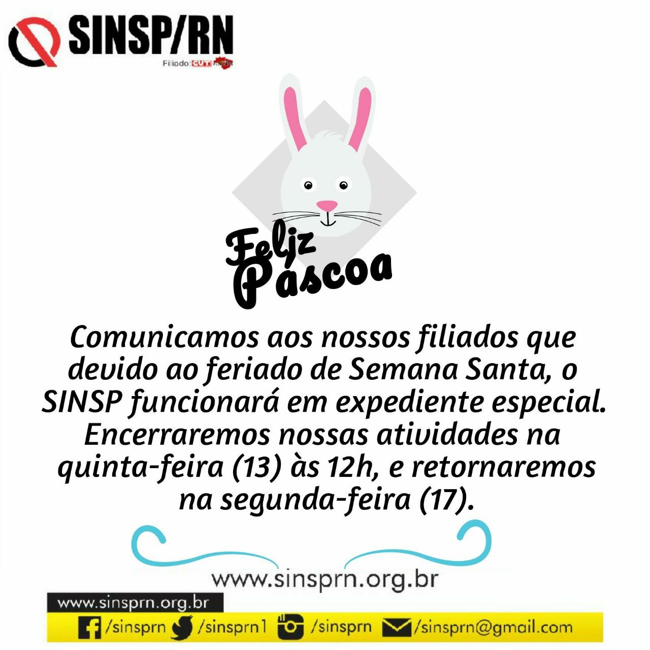Comunicamos aos nossos filiados que devido ao feriado de Semana Santa, o SINSP funcionará em expediente especial. Encerraremos nossas atividades na quinta-feira (13) às 12h, e retornaremos na segunda-feira (17).