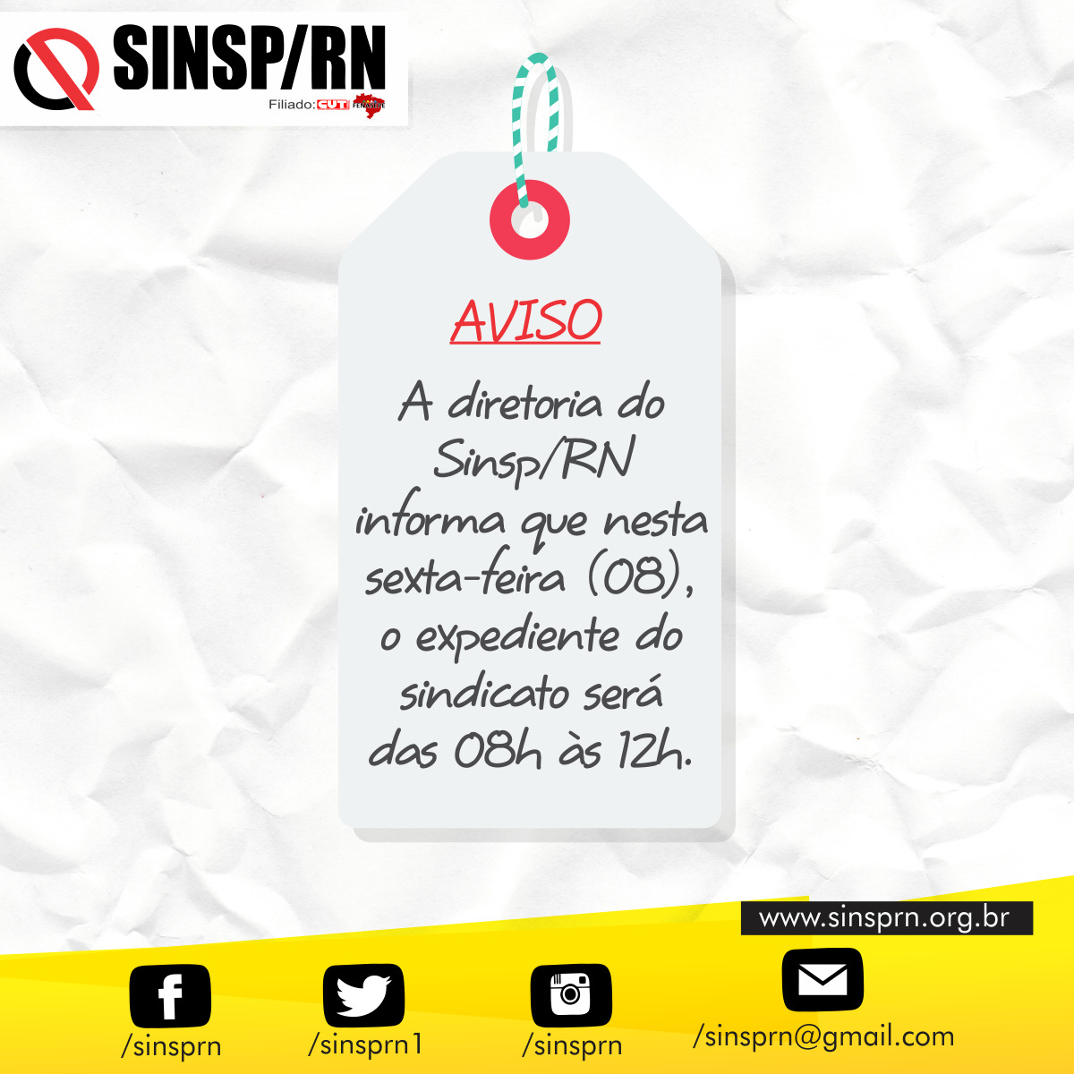 Nesta sexta feira (08) o expediente será reduzido. Funcionaremos das 8h às 12h. O sinsp agradece a compreensão de todos e todas que fazem parte do sindicato e buscam o atendimento diário para tirarem dúvidas, encaminharem documentos ou realizarem outros serviços.
