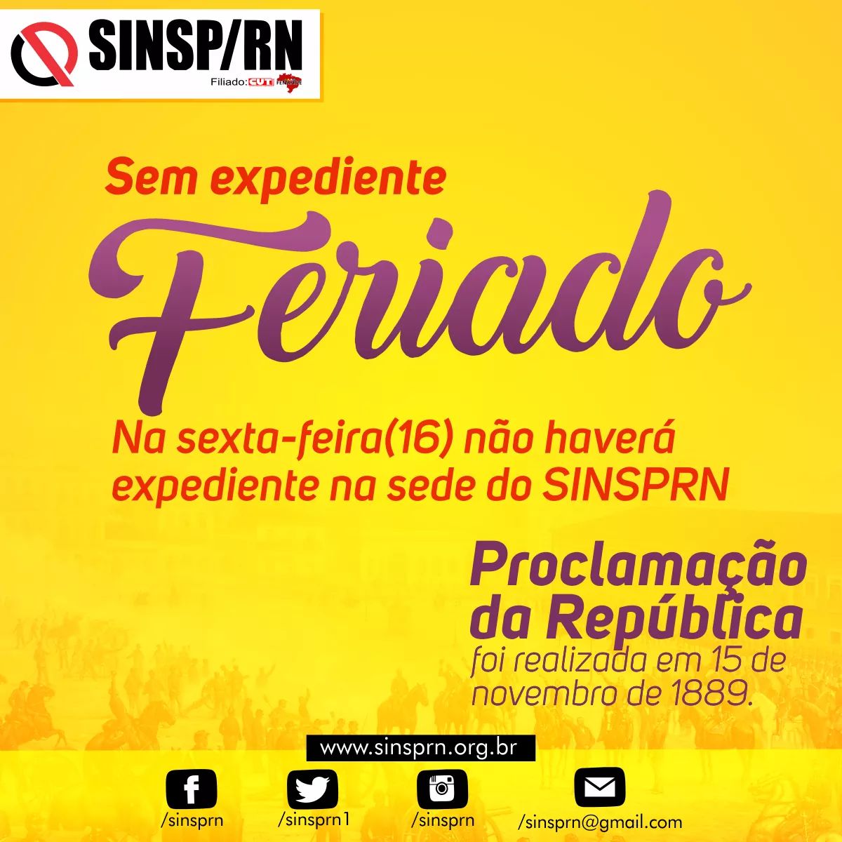 Compartilhe Telegram WhatsApp Facebook Twitter Email Copy Link O SINSP/RN informa aos nossos sindicalizados que não haverá expediente, nesta sexta-feira 16 de novembro, em virtude do feriado. Desejamos a todos, um excelente feriado! Retornamos às atividades normalmente na segunda-feira, 19.