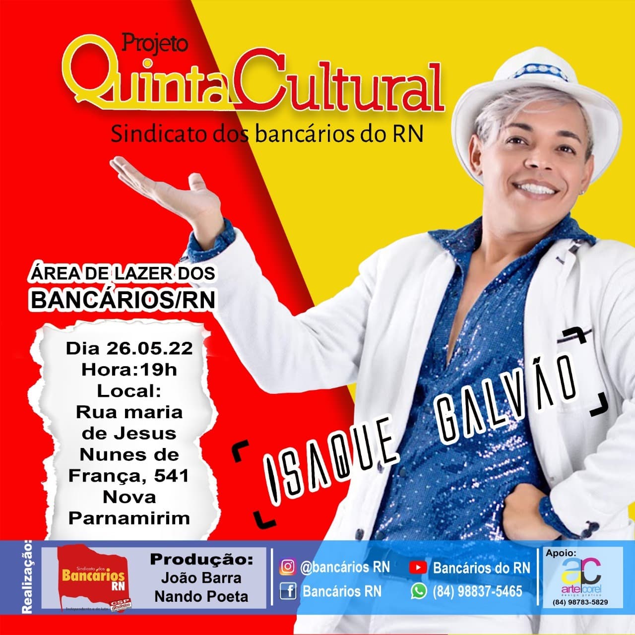 A abertura será em alto estilo, com o espetáculo do cantor Isaque Galvão, às 19h, na área de lazer dos Bancários do RN, rua Maria de Jesus, 61 – Nova Parnamirim. O projeto segue até novembro com um total de sete apresentações.