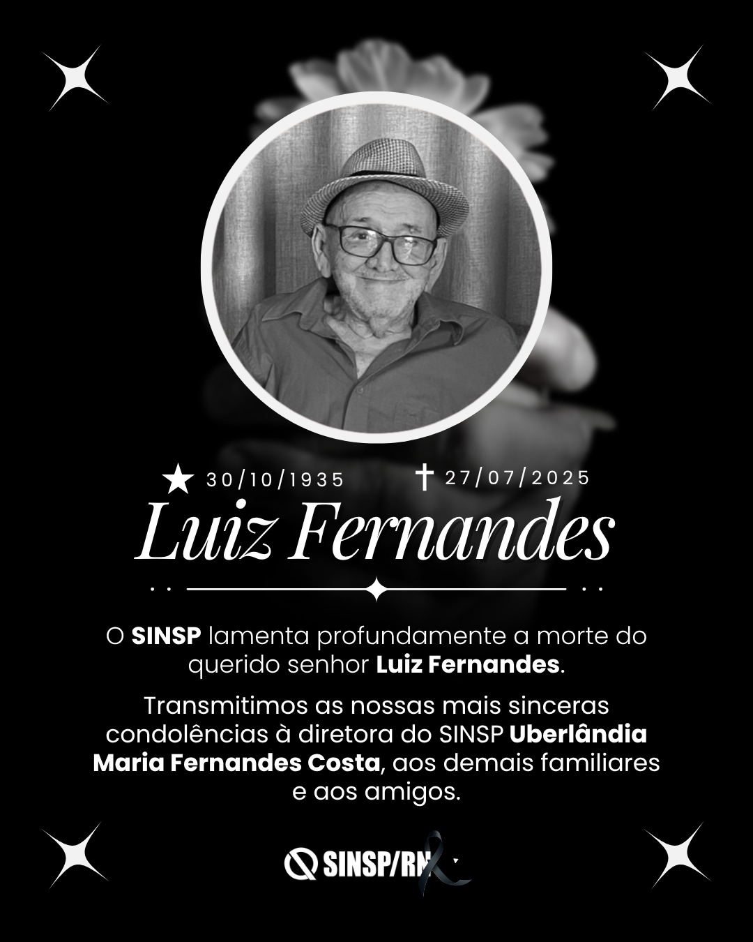 Luto: lamentamos o falecimento de Luiz Fernandes, pai da diretora do SINSP Uberlândia Maria Fernandes