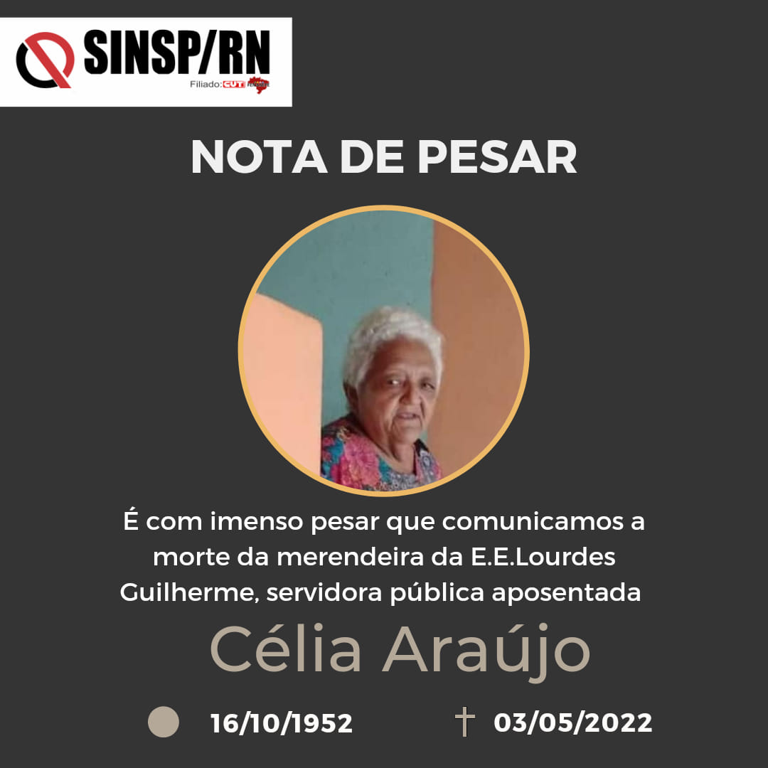 É com profunda tristeza que o SINSP vem à público informar sobre a morte de Célia Araújo, servidora que atuou na Educação do Estado, na Escola Lourdes Guilherme.