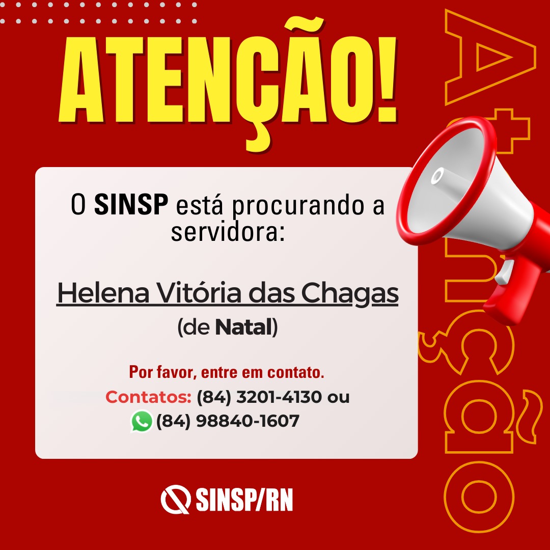 A servidora Helena Vitória das Chagas, moradora de Natal precisa entrar em contato com o sindicato urgentemente.
