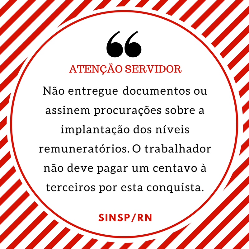 Nós que fazemos o Sindicato dos Trabalhadores do Serviço Público da Administração Direta do RN (Sinsp/RN), que representamos legitimamente todos os servidores da administração, sejam lotados nas Secretarias do Governo do Estado, nas escolas e Direcs, dizemos aos servidores que não entreguem documentos ou assinem procurações sobre a implantação dos níveis remuneratórios. O Governo do Estado já publicou os dois níveis para as três categorias (GNO, GNM e GNS), comprometeu-se de pagar os retroativos, isso foi conquistado e negociado politicamente e administrativamente. O trabalhador não deve pagar um centavo à terceiros por esta conquista.