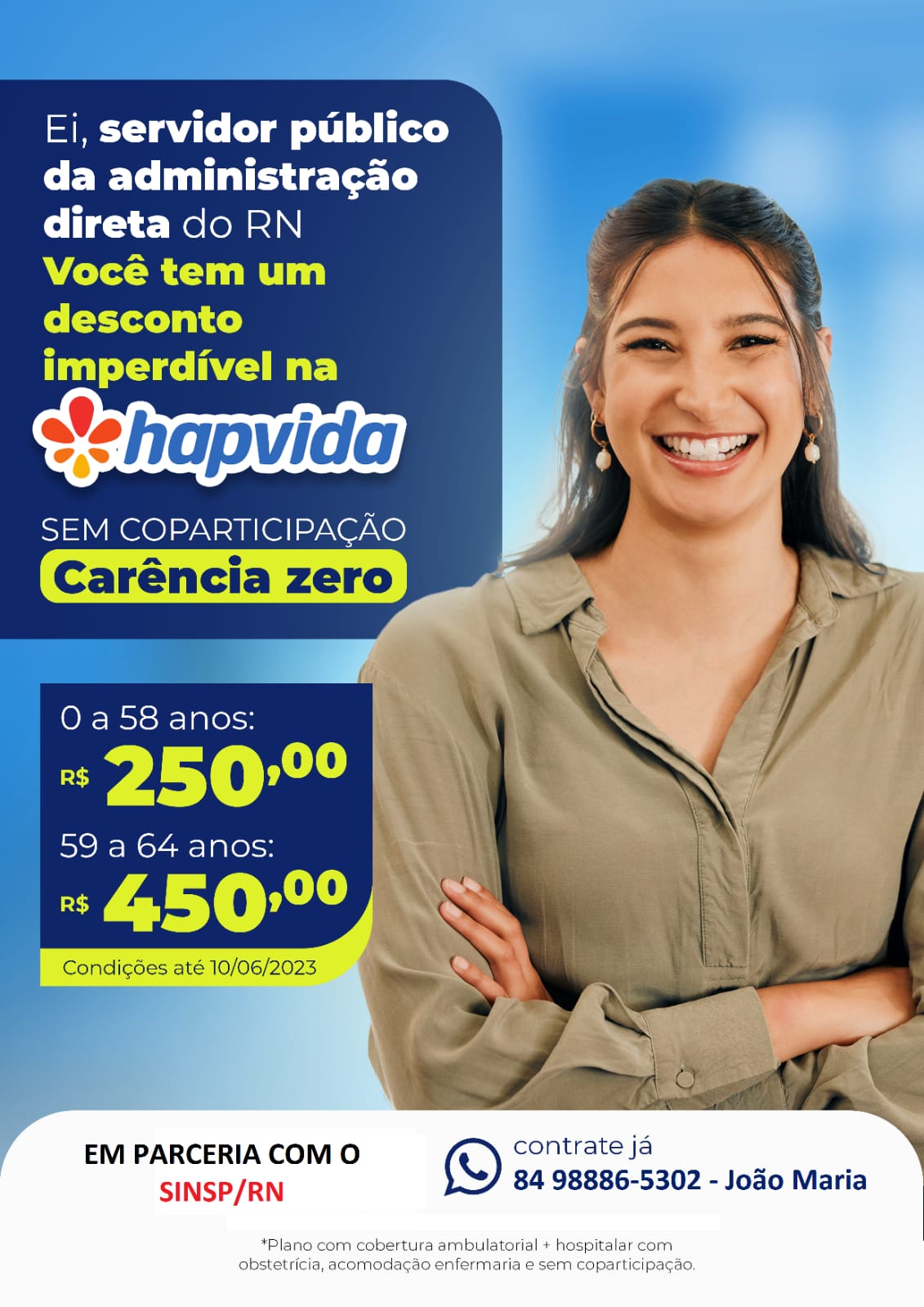O servidor público da Administração Direta que é filiado ao SINSP pode participar do plano de saúde da HAPVIDA com custo de R$ 250,00 para quem tem entre 0 e 58 anos, e R$ 450,00 para pessoas com idade entre 59 e 64 anos.