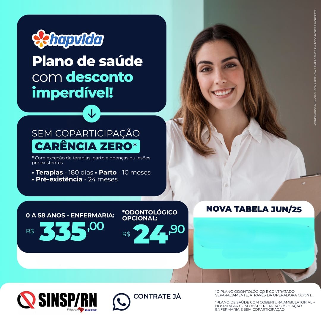 O servidor público da Administração Direta que é filiado ao SINSP pode participar do plano de saúde da HAPVIDA com custo de R$ 335,00 para quem tem entre 0 e 58 anos, e ainda é possível incluir plano odontológico por R$ 24,90.