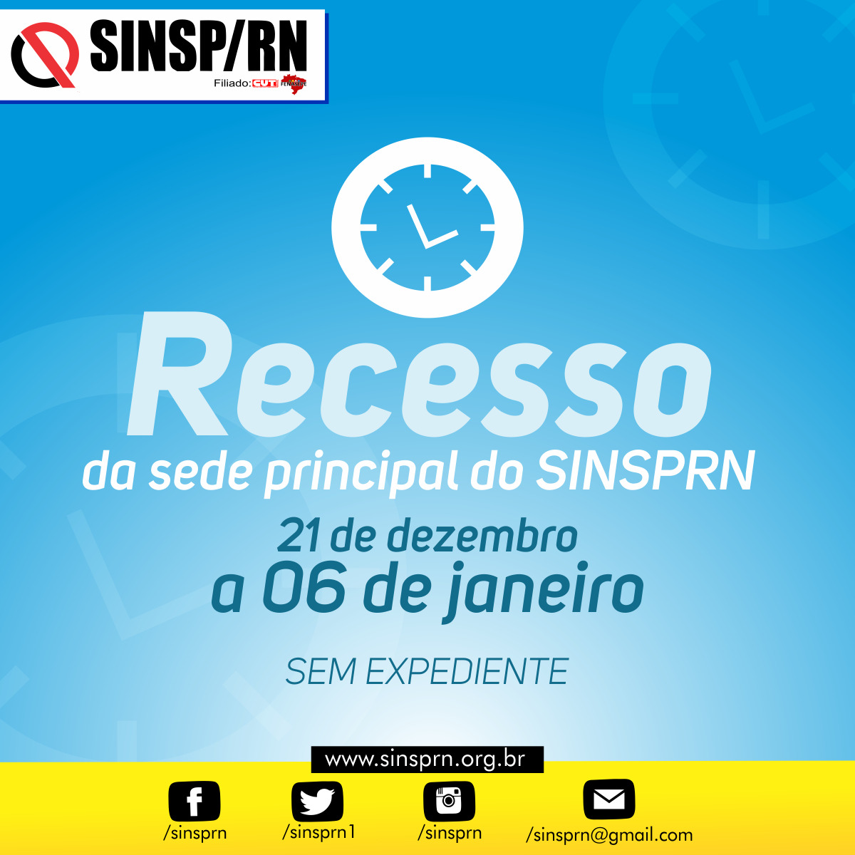 O SINSPRN comunica que do dia 21 de dezembro ao dia 6 de janeiro não haverá expediente na sede localizada da Rua Princesa Isabel, 774 e na nossa sede localiza em Mossoró, o recesso será de 20 de dezembro ao dia 6 de janeiro de 2019. Desejamos a todos e a todas um Feliz Natal e um Próspero Ano Novo.