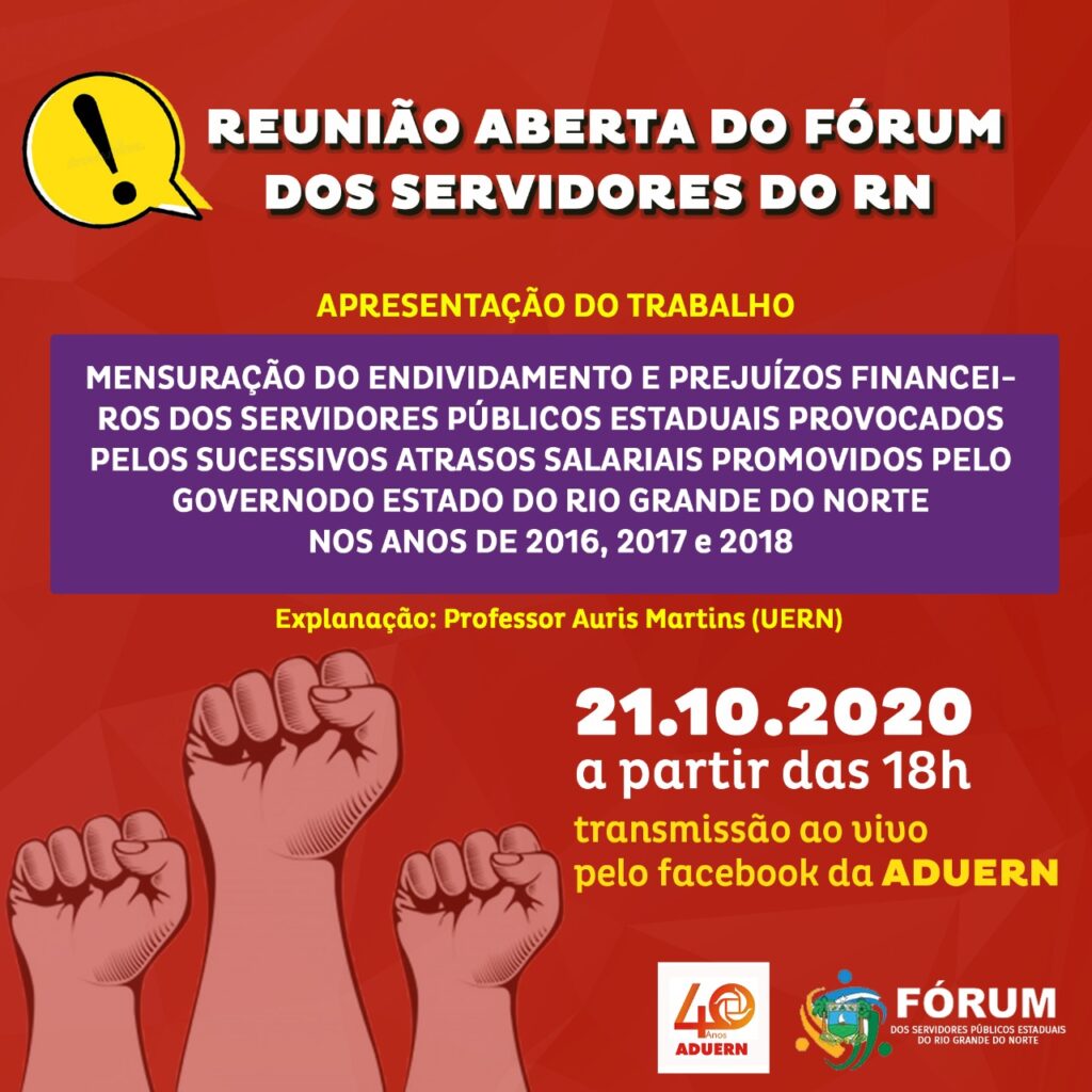 Nesta quarta-feira (21), a partir das 18h, o Fórum Estadual dos Servidores realiza uma reunião aberta ao público para discutir o impacto social ocasionado a partir dos atrasos salariais na vida do funcionalismo público potiguar. A transmissão acontece neste link.