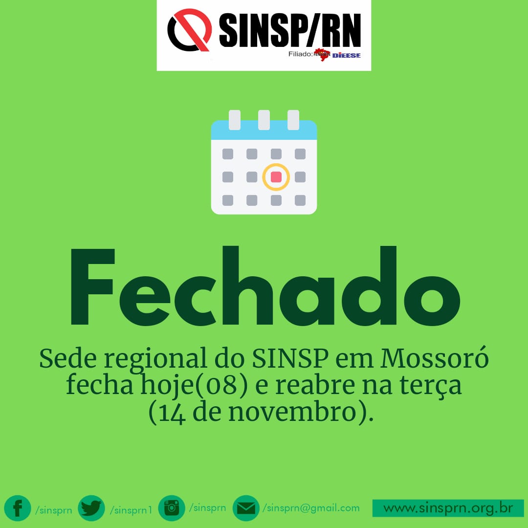 A sede regional do SINSP na cidade de Mossoró está fechada para manutenção e voltará a atender os servidores do Oeste Potiguar no dia 14 de novembro..