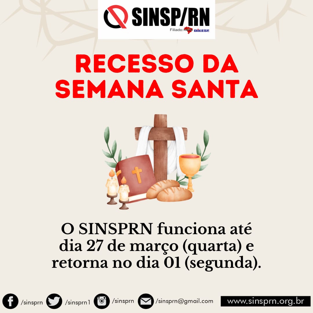 Servidor, caso você necessite de atendimento administrativo ou jurídico no SINSP durante a semana santa, procure o sindicato até a quarta-feira (27), pois não haverá expediente na quinta e sexta-feira.