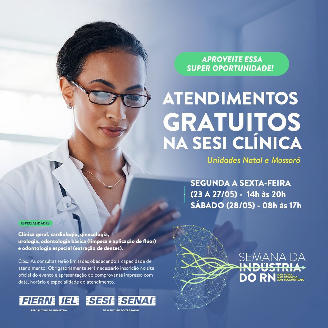 Como parte das ações da Semana da Indústria, que acontece entre os dias 23 e 28 deste mês, o SESI RN realiza atendimentos sociais na área da saúde (médico e odontológico) para público em geral, nas cidades de Natal e Mossoró. A programação inclui ‘Ação Cidadania do SESI’ que acontece no sábado 28, encerrando os atendimentos para a comunidade.