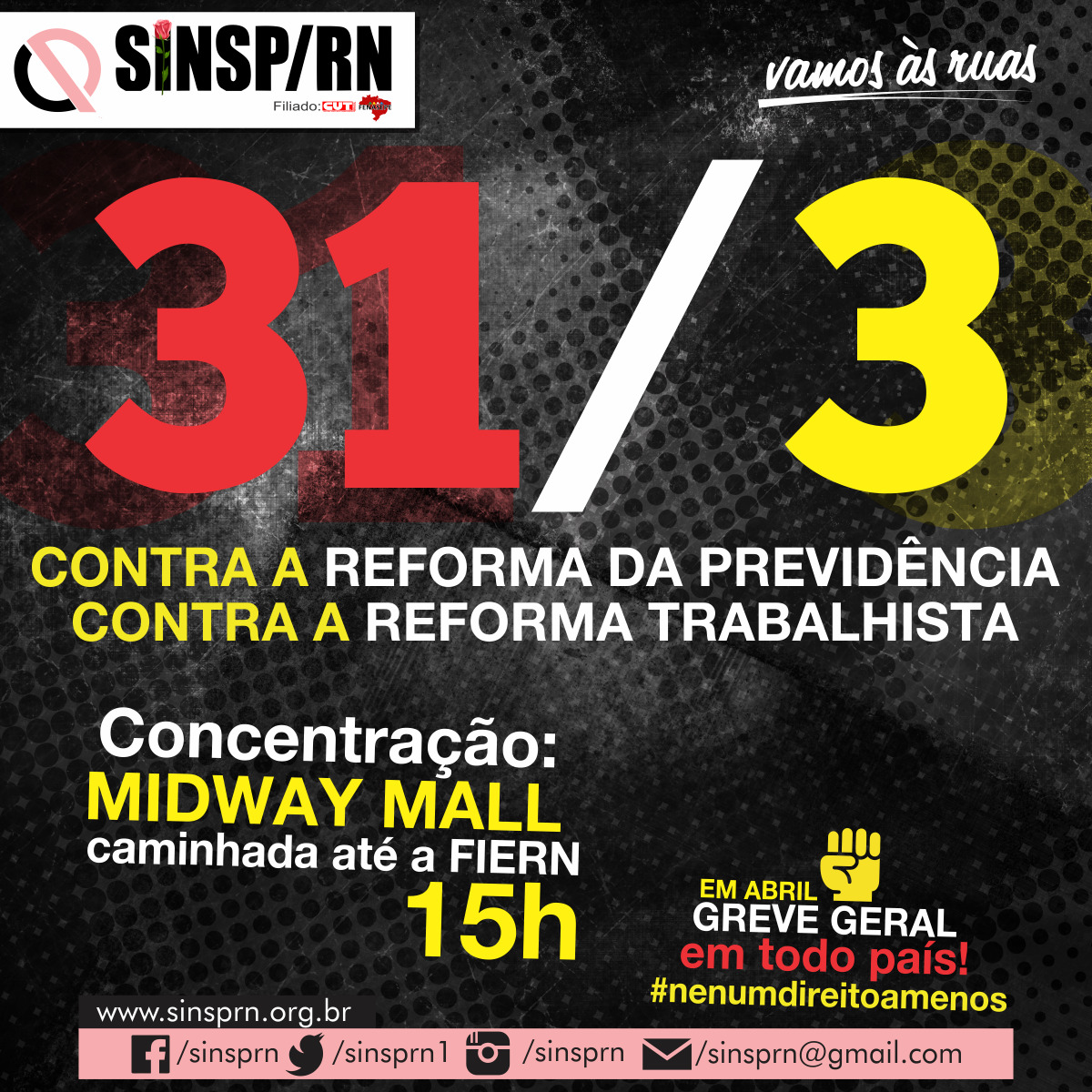As centrais sindicais convocam todas as trabalhadoras e trabalhadores do Brasil para irem às ruas no próximo dia 31 de março, contra as reformas da previdência e trabalhista. O SINSP conclama todos os servidores da administração direta do RN à se unirem nesta luta e participarem do ato que acontecerá, nesta sexta-feira (31), a partir das 15h em frente ao IFRN, campus central, localizado na Av. Sem. Salgado Filho de onde partiremos em caminhada, dizendo NÂO à toda esta agenda retrocessos.