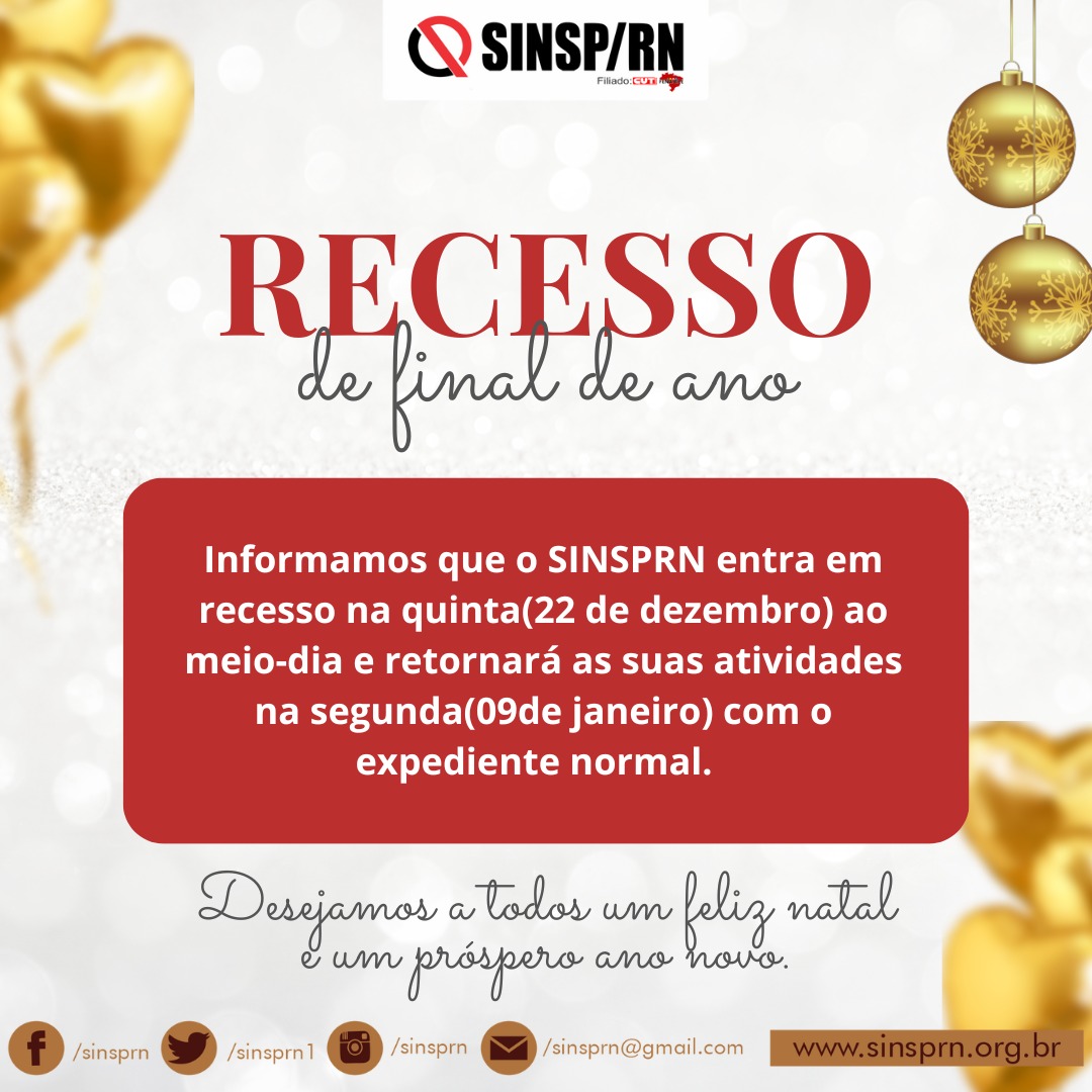 Caros servidores públicos do nosso Estado, comunicamos a todos e todas que o SINSP fechará para recesso natalino a partir das 12h de 22 de dezembro e retornará as suas atividades no dia 09 de janeiro de 2023.