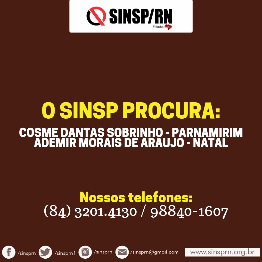 Atenção! O SINSP tenta localizar Cosme Dantas Sobrinho, de Parnamirim; e Ademir Morais de Araújo, de Natal. Eles precisam entrar em contato com o sindicato urgentemente, pois temos informações sobre seus alvarás.