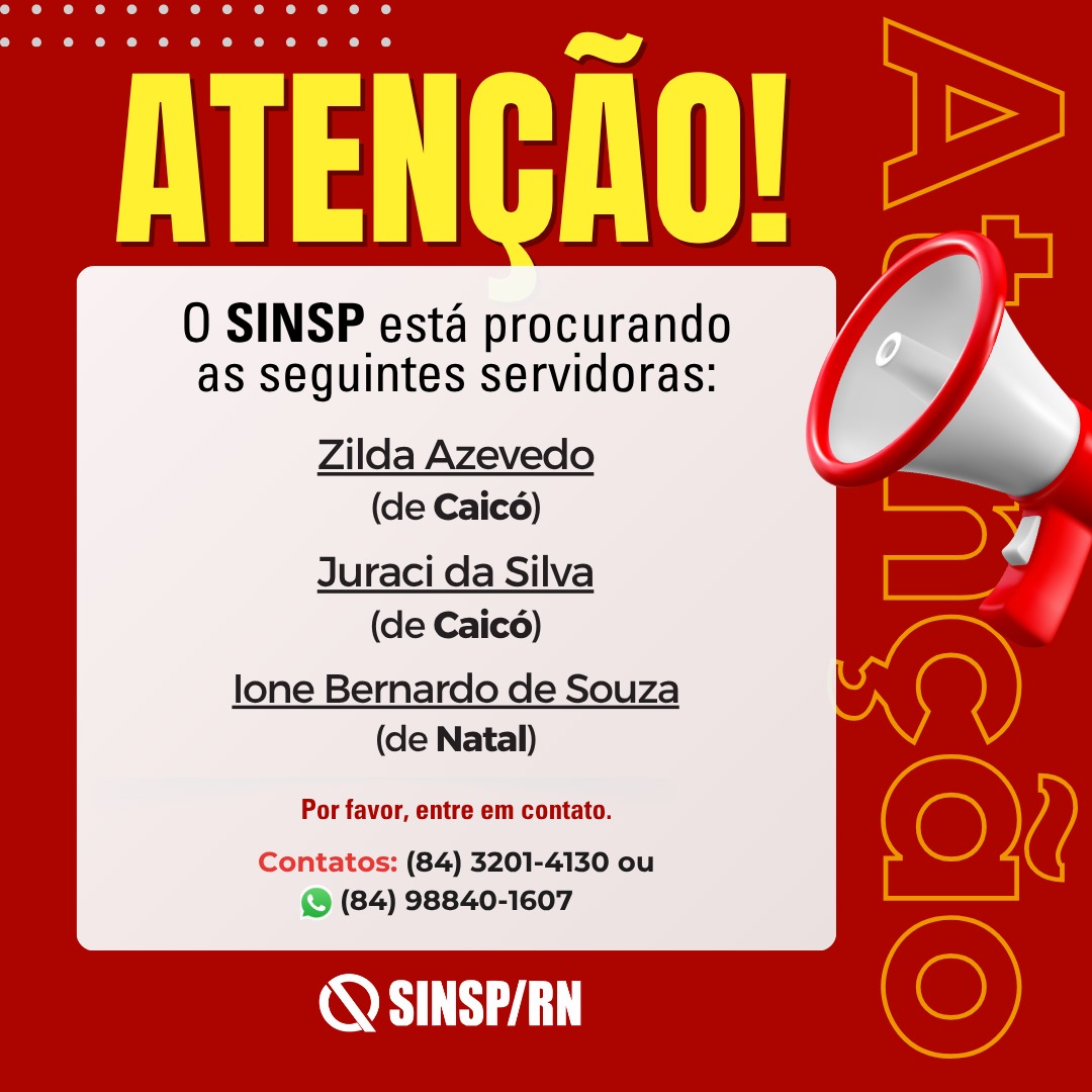 O SINSP busca contato urgente das servidoras listadas. Pedimos que caso conheça alguma delas, informe a nossa procura.