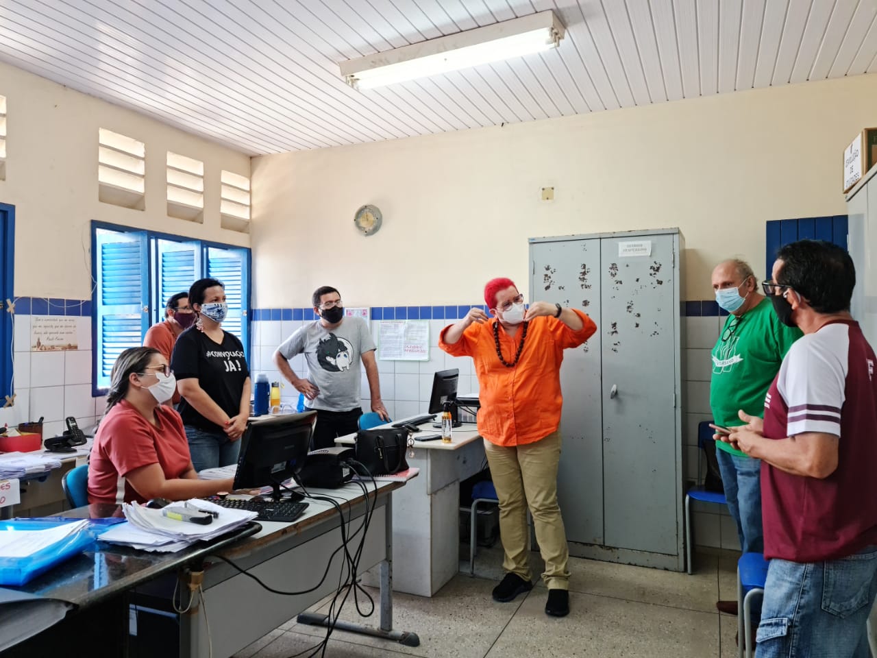 A presidenta do SINSP, Janeayre Souto, e a diretora do SINSP Maria José, viisitaram a Escola Estadual Aldo Fernandes, no conjunto Gramoré, na manhã desta segunda-feira (14) e puderam observar de perto que os gestores da escola não cumprem o próprio decreto do Estado e ordena os servidores a trabalharem sem equipamentos de proteção individual. Já não basta o funcionário ser obrigado a enfrentar a pandemia diariamente e ir ao seu local de trabalho, além disso a própria direção não faz o mínimo para proteger a saúde dos servidores.