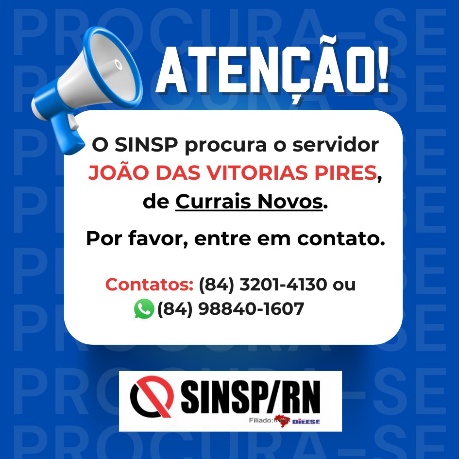 Atenção! O SINSP tenta localizar o servidor João das Vitorias Pires, morador de Currais Novos.