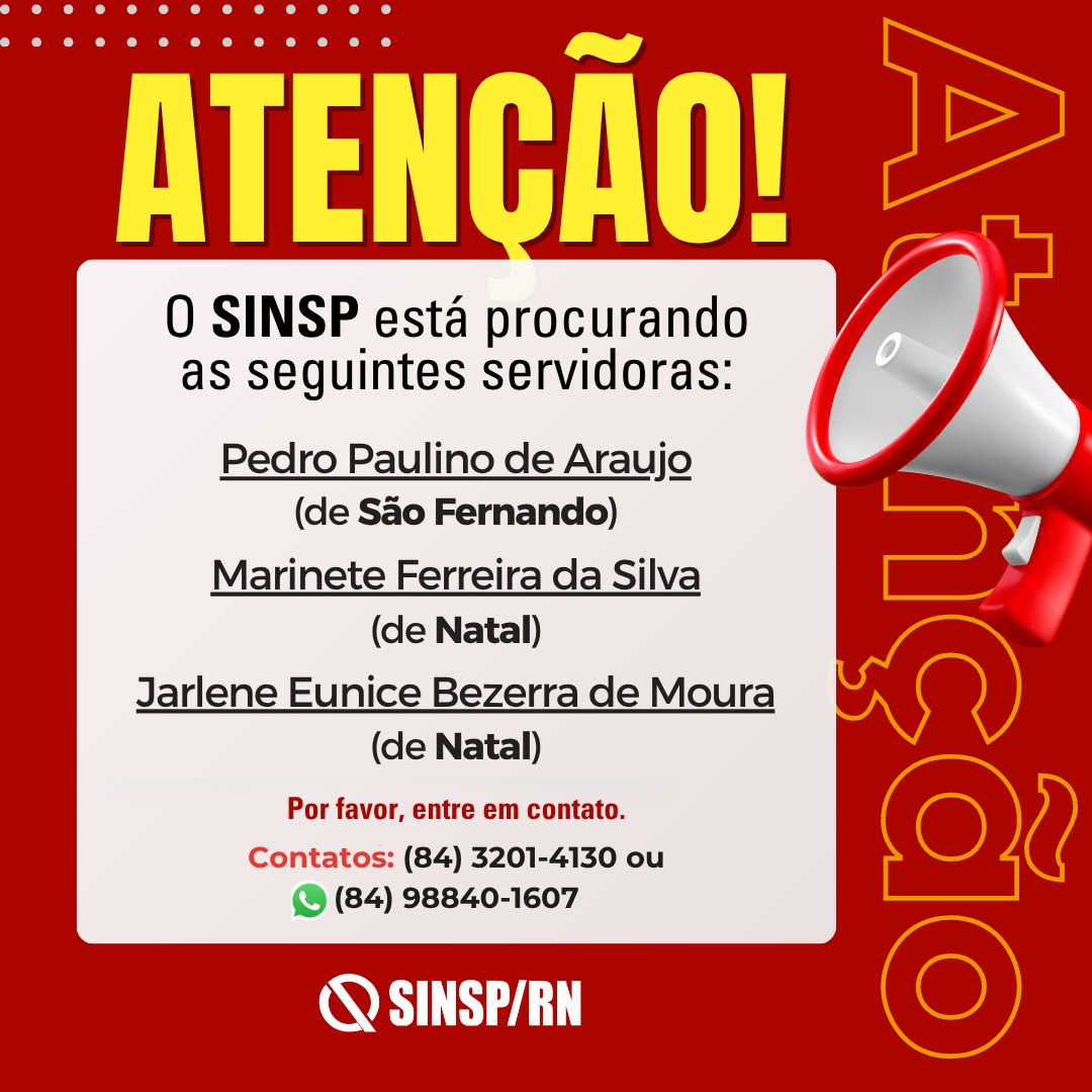 Home»Servidores»Urgente: SINSP procura por Pedro Paulino, Marinete Ferreira e Jarlene Eunice