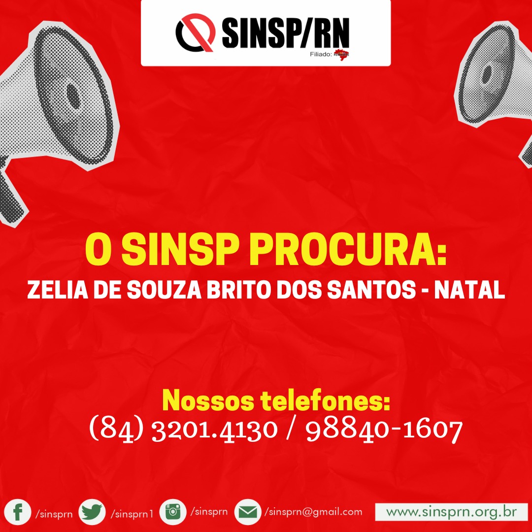 Atenção! O SINSP tenta localizar Zélia de Souza Brito dos Santos, moradora de Natal, que precisa entrar em contato com o sindicato urgentemente. Pedimos que caso a conheça, possa repassar a informação para que seja localizada rapidamente.