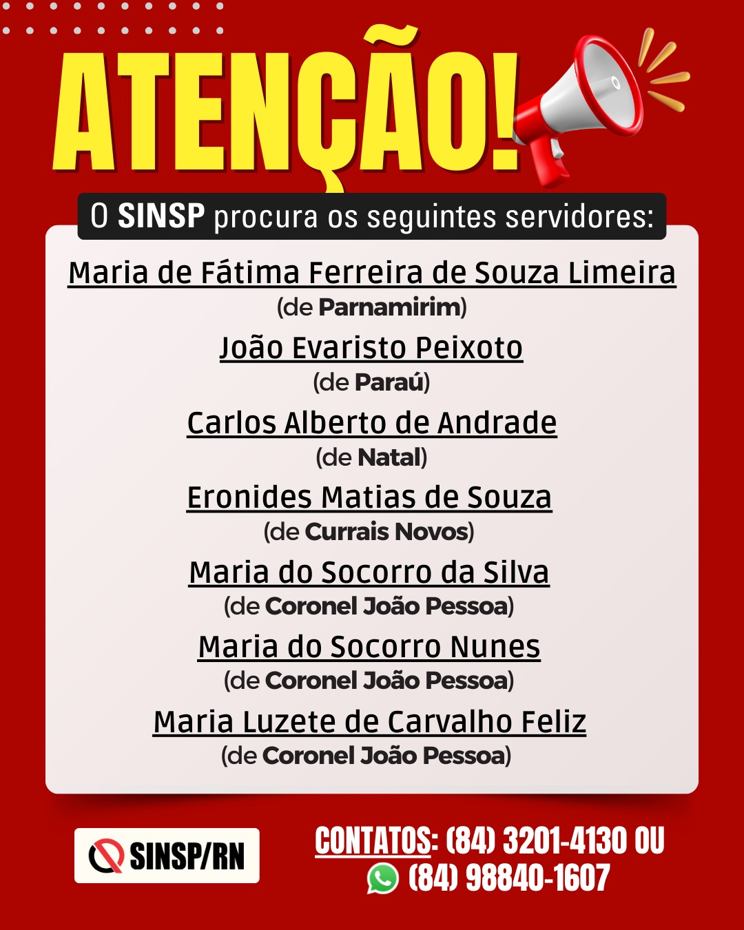 O SINSP busca contato urgente dos servidores listados. Pedimos que caso conheça algum deles, informe a nossa procura.