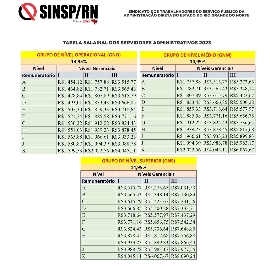 Servidor, veja abaixo as tabelas com o demonstrativo de reajuste de 14,95% para servidores GNO, GNM e GNS em 2023.